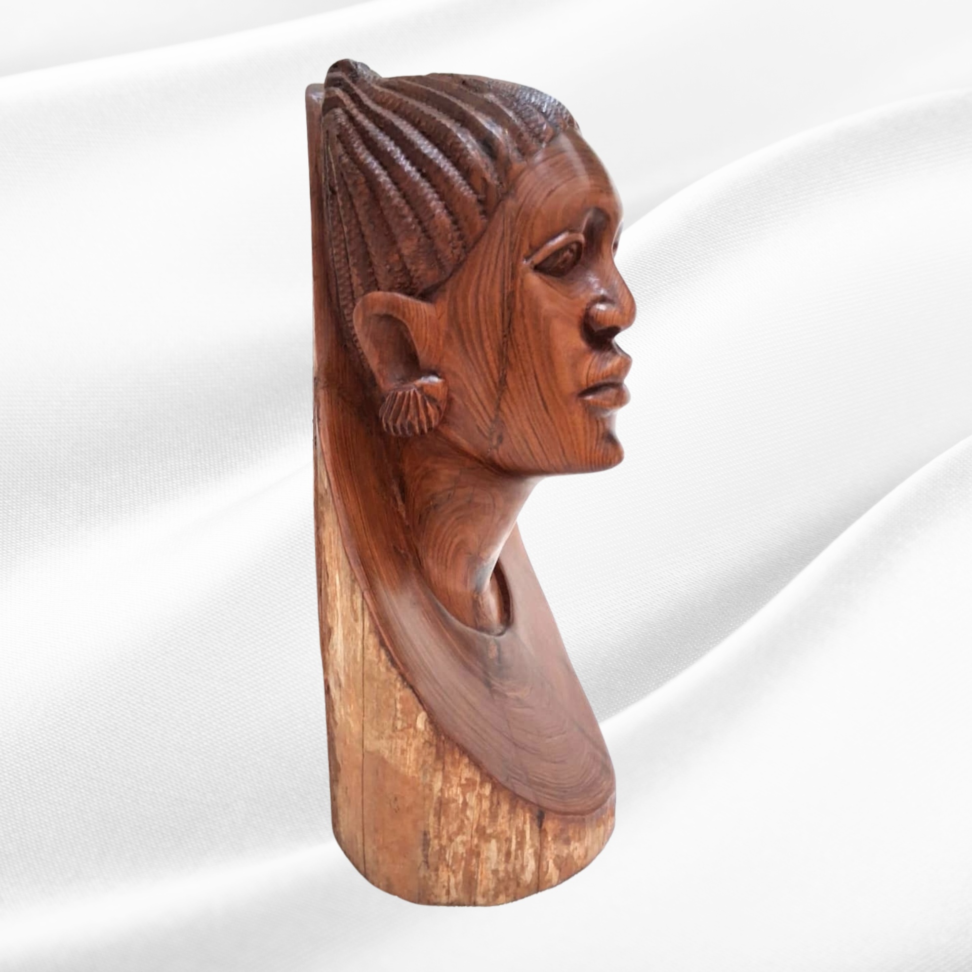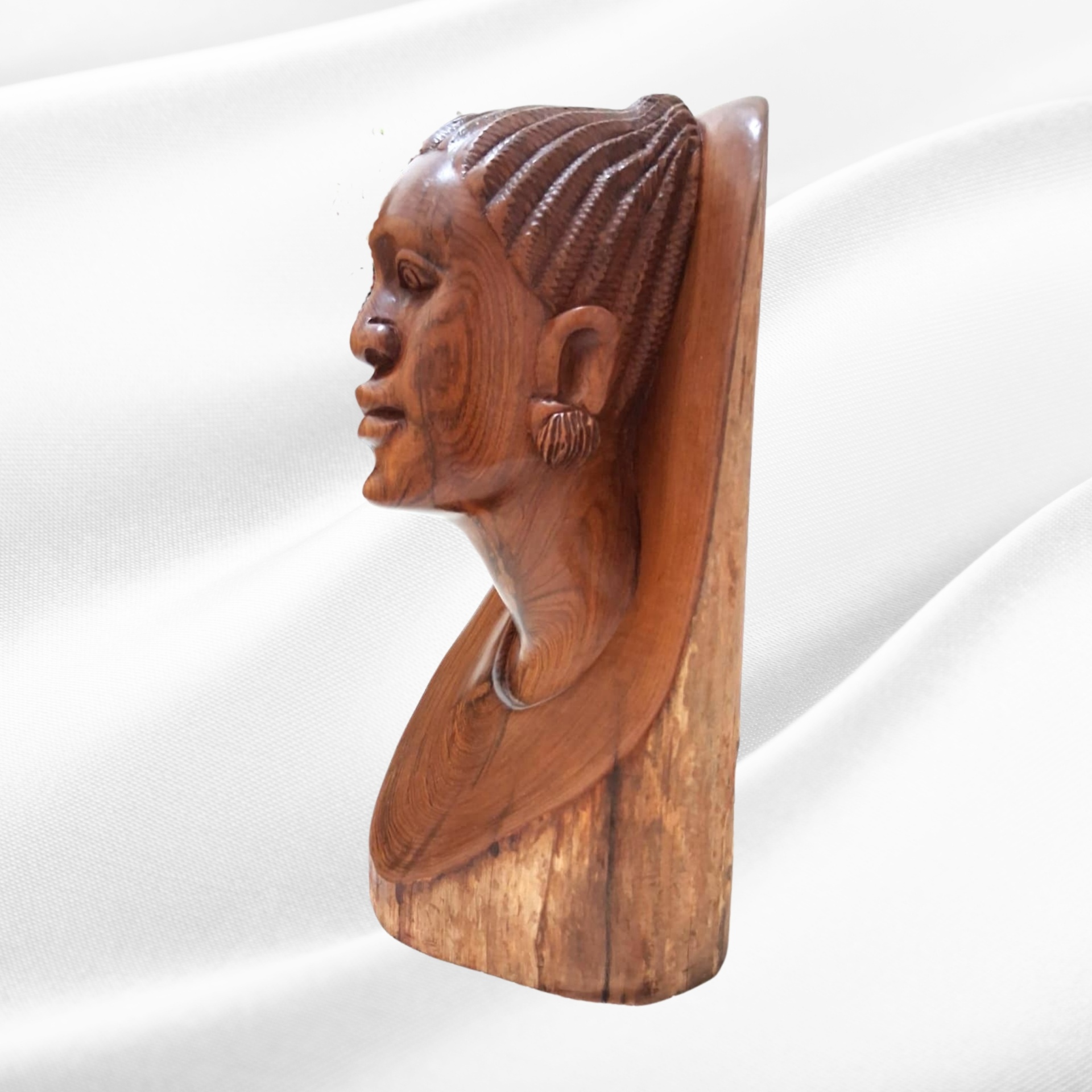 “Busto de mulher com tranças” é, assim, uma celebração da beleza feminina africana e da memória cultural que se transmite de geração em geração, reafirmando a sensibilidade e a mestria técnica do escultor.