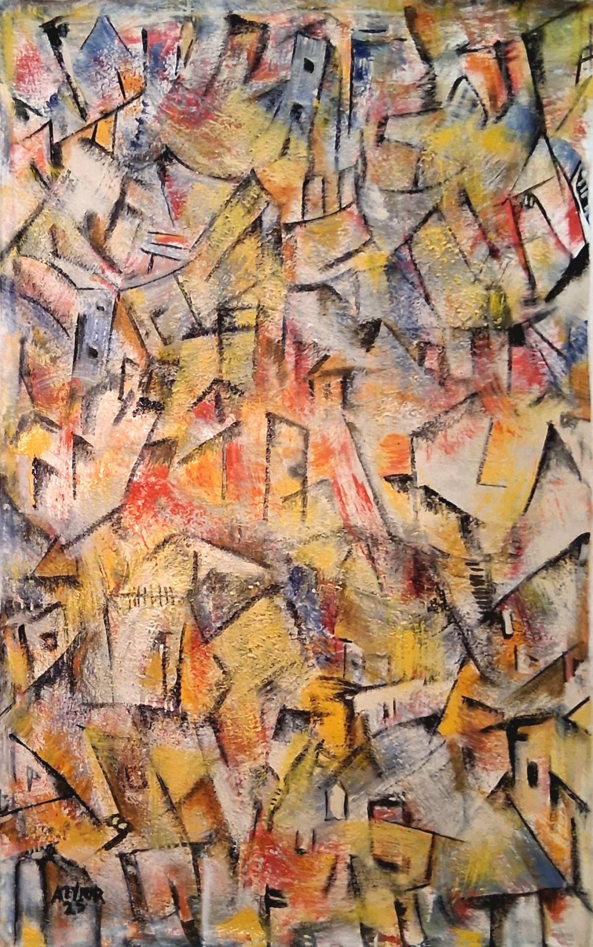 Mais do que representar casas, ruas ou fachadas concretas, Azymir recria uma paisagem interior, onde o casario surge fragmentado, reinventado, quase dissolvido em planos cromáticos e ritmos geométricos que dialogam entre si. A influência do mestre sente-se na intensidade expressiva e na densidade emocional da composição, mas o olhar afirma-se, desde logo, como uma perspectiva claramente autónoma, marcada por uma linguagem abstracta própria e madura.