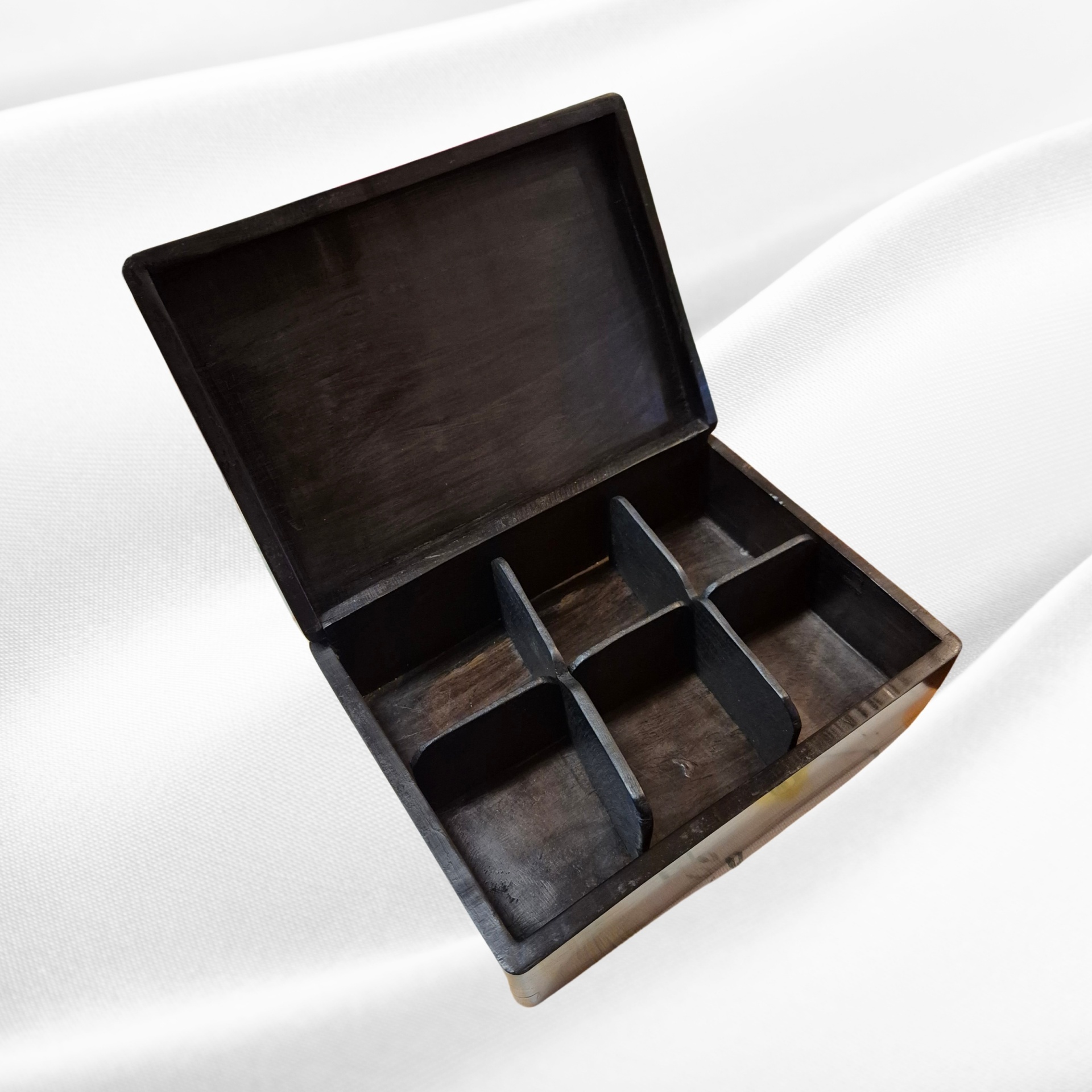 O interior, cuidadosamente acabado, oferece o espaço ideal para a guarda de jóias e pequenos objectos de valor, protegendo-os da luz e do pó. A articulação da tampa é precisa e firme, assegurando durabilidade e funcionalidade, sem comprometer a estética.