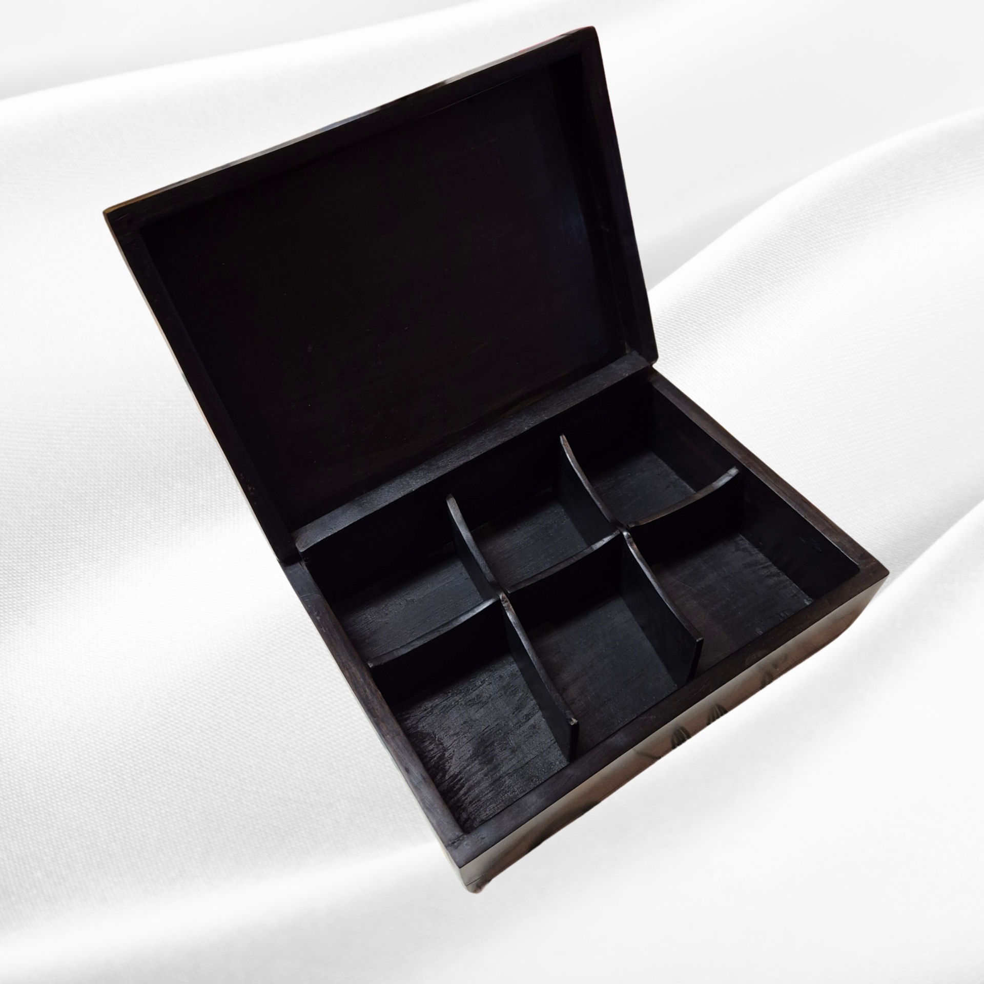 O interior, cuidadosamente acabado, oferece o espaço ideal para a guarda de jóias e pequenos objectos de valor, protegendo-os da luz e do pó. A articulação da tampa é precisa e firme, assegurando durabilidade e funcionalidade, sem comprometer a estética.