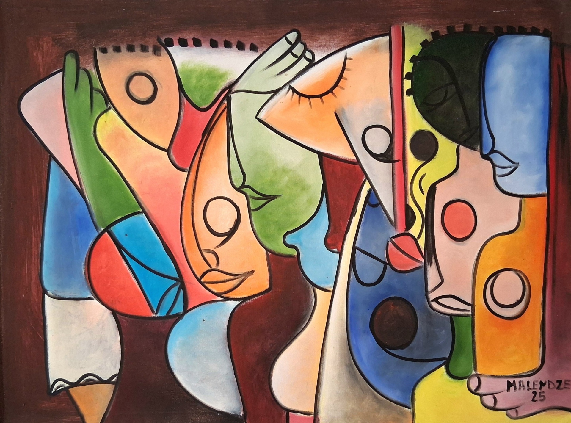 A composição é dinâmica, quase cénica, evocando um palco onde cada personagem desempenha o seu papel social. A paleta cromática, vibrante e contrastada, reforça a ideia de espectáculo: cores que atraem, que seduzem, que impõem presença. Contudo, sob essa camada luminosa, pressente-se uma densidade crítica, típica da abordagem reflexiva de Malendze.