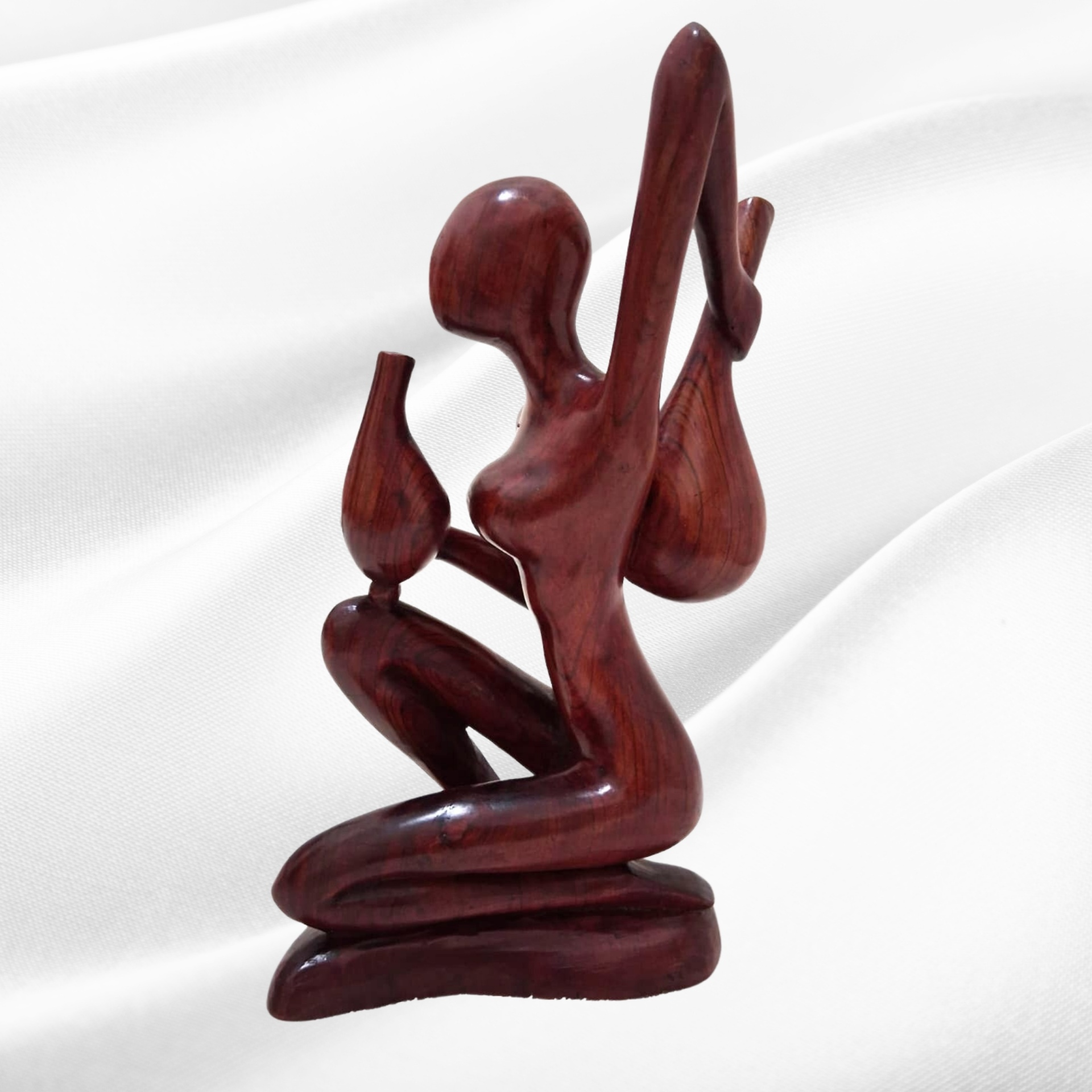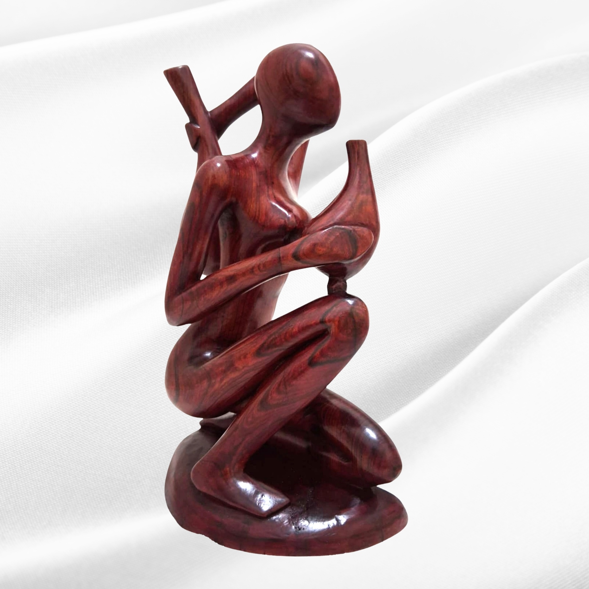 Executada em Pau Rosa (Berchemia zeyheri), madeira de tonalidade rosadae subtis variações cromáticas, a peça mede 31 cm de altura e pesa 1,250 kg. A escolha desta madeira nobre não é inocente: o seu grão fino e a sua resistência permitem um entalhe rigoroso, preservando simultaneamente a suavidade das formas e a delicadeza dos pormenores.