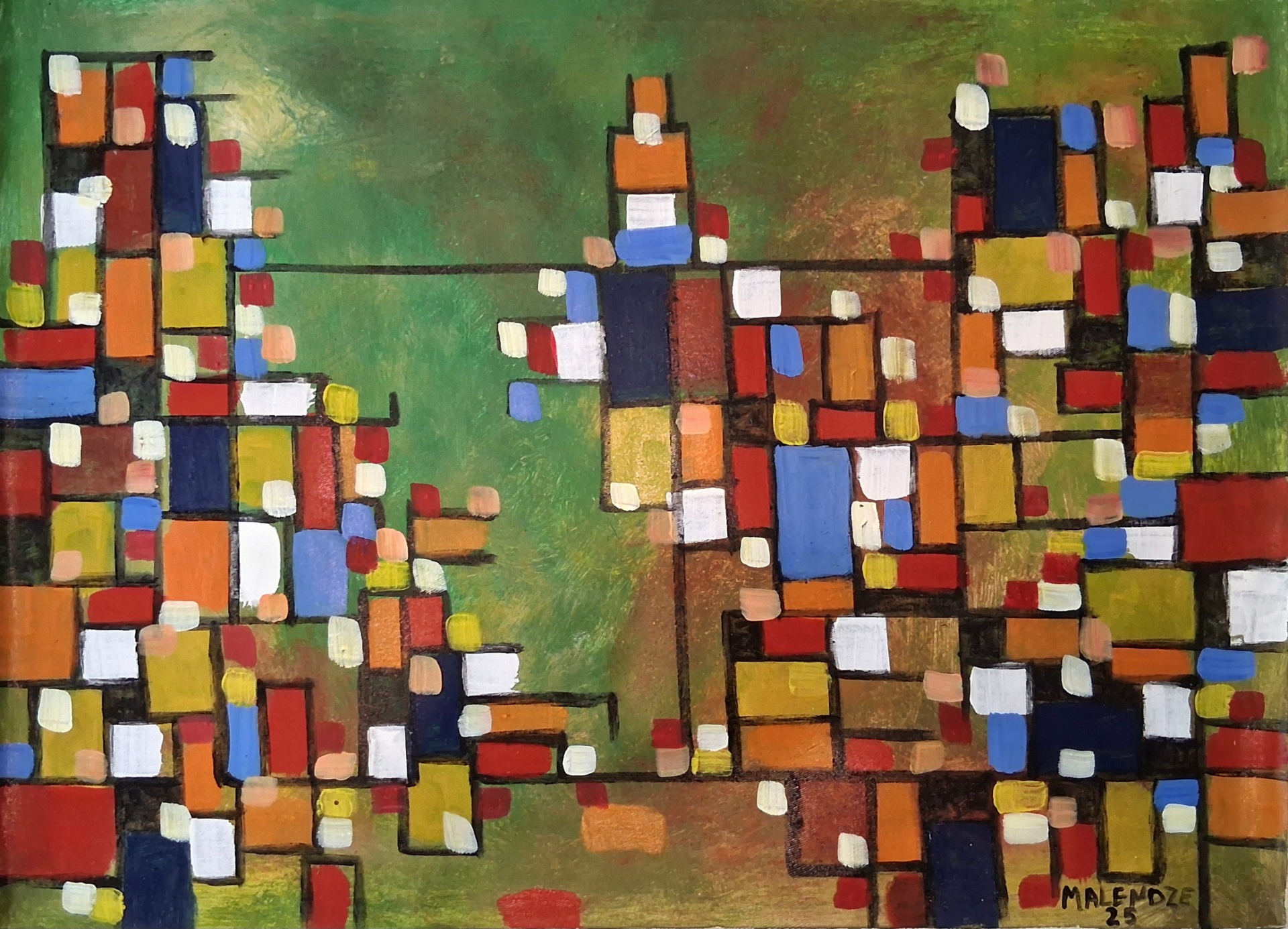 A composição constrói-se a partir de linhas verticais e horizontais que se entrecruzam, formando uma grelha aparentemente rígida. Essa quadrícula, formada por quadrados coloridos, evoca o traçado geométrico de ruas, quarteirões e lotes, característico de muitos bairros da capital moçambicana. Contudo, Malendze não se limita a reproduzir um mapa: fragmenta-o, distorce-o, sobrepõe planos e densifica a matéria pictórica, sugerindo que sob a ordem geométrica pulsa uma realidade orgânica e imprevisível.
