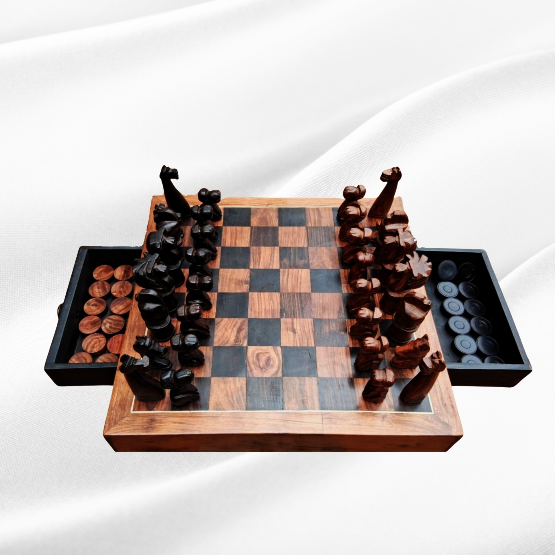 O conjunto inclui peças completas de Xadrez e de Damas, igualmente executadas em Pau Preto e Sândalo, respeitando o contraste tradicional entre claros e escuros. As peças de Xadrez apresentam linhas depuradas, com um desenho contemporâneo que substitui a identidade clássica de cada figura — rei, rainha, torres, bispos, cavalos e peões — por figuras que representam animais selvagens de África, enquanto as peças de damas, de formato simples e preciso, mantêm a coerência estética com o tabuleiro.